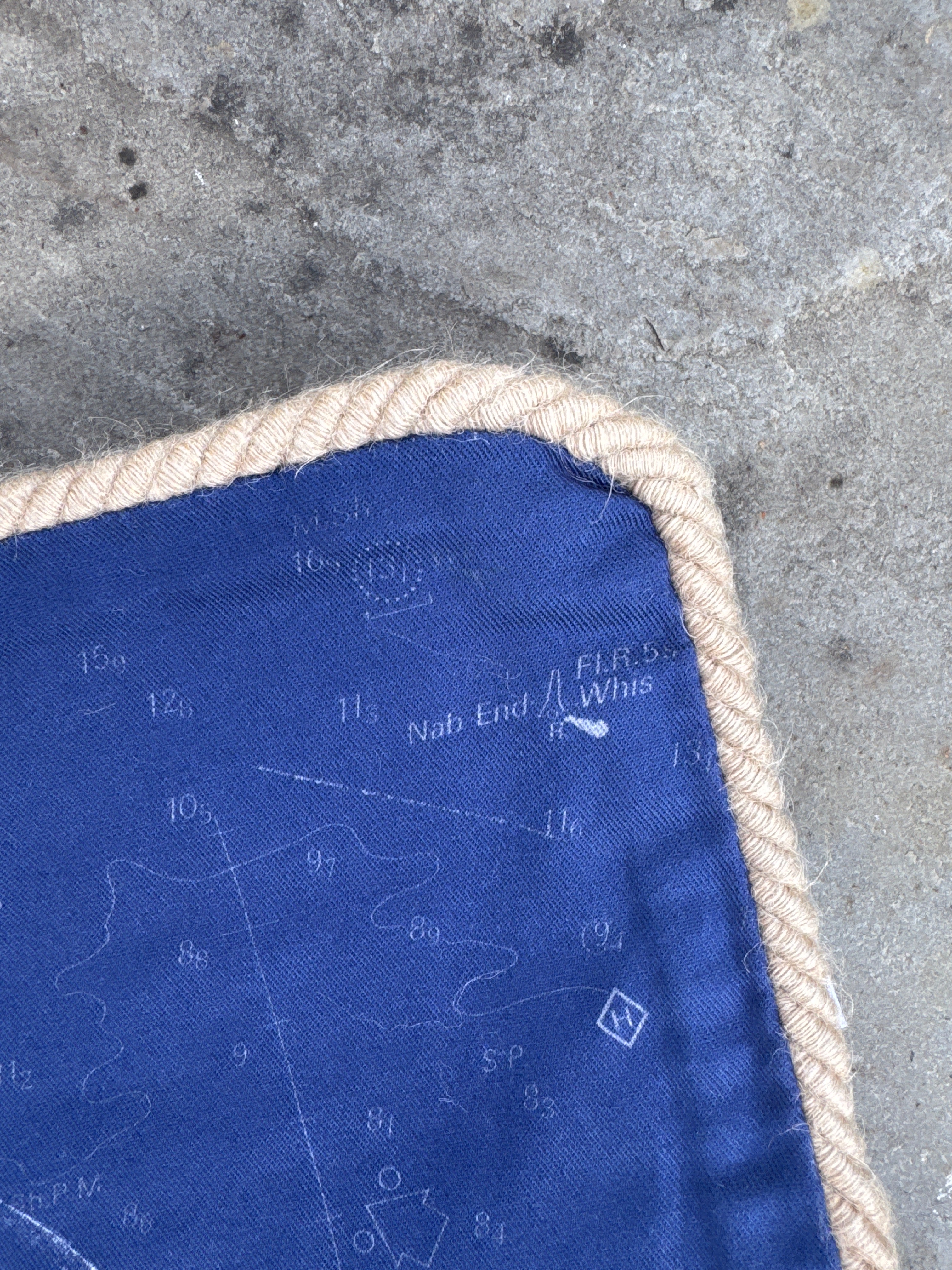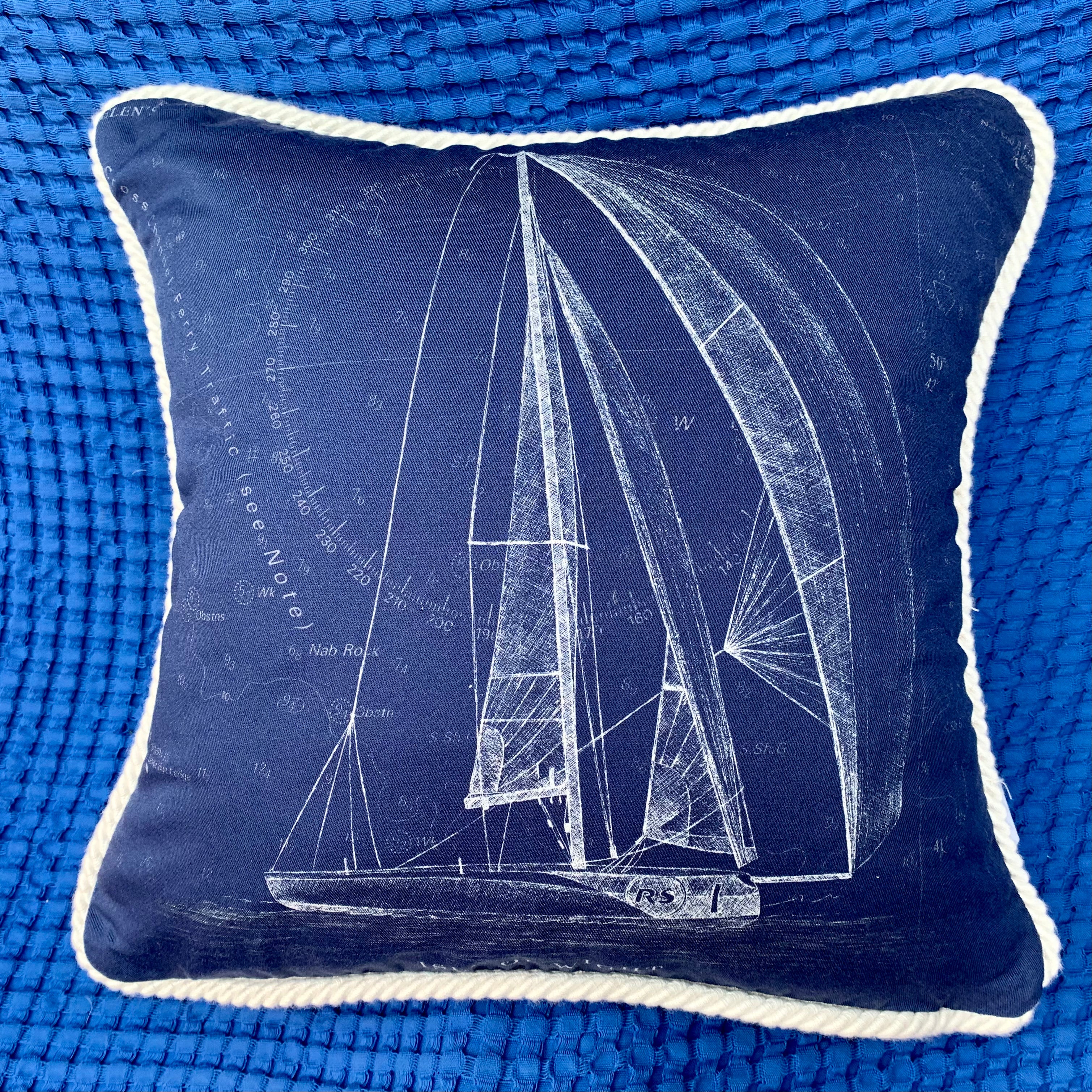 Hand-drawn RS1 yacht with nautical chart background detail, finished with jute rope detail. Printed in the UK on sustainable cotton.