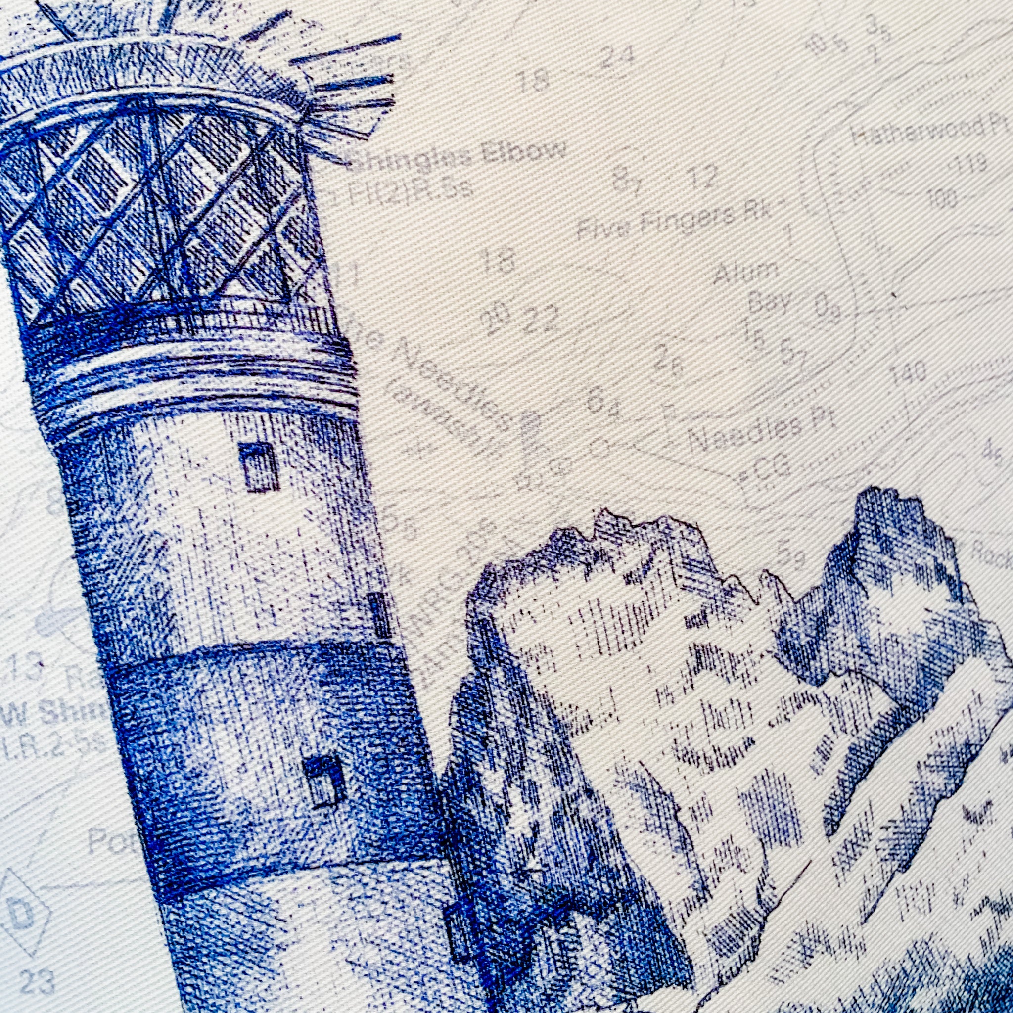 The Isle of Wight’s famous landmark, The Needles, have been hand drawn with the back drop of the nautical charts that sailors use to enter and leave The Solent waters, between the mainland and island. A challenging stretch of water, that narrows and squeezes tides between the land masses, coupled with shallow waters and seabeds full of rocks and wreaks!