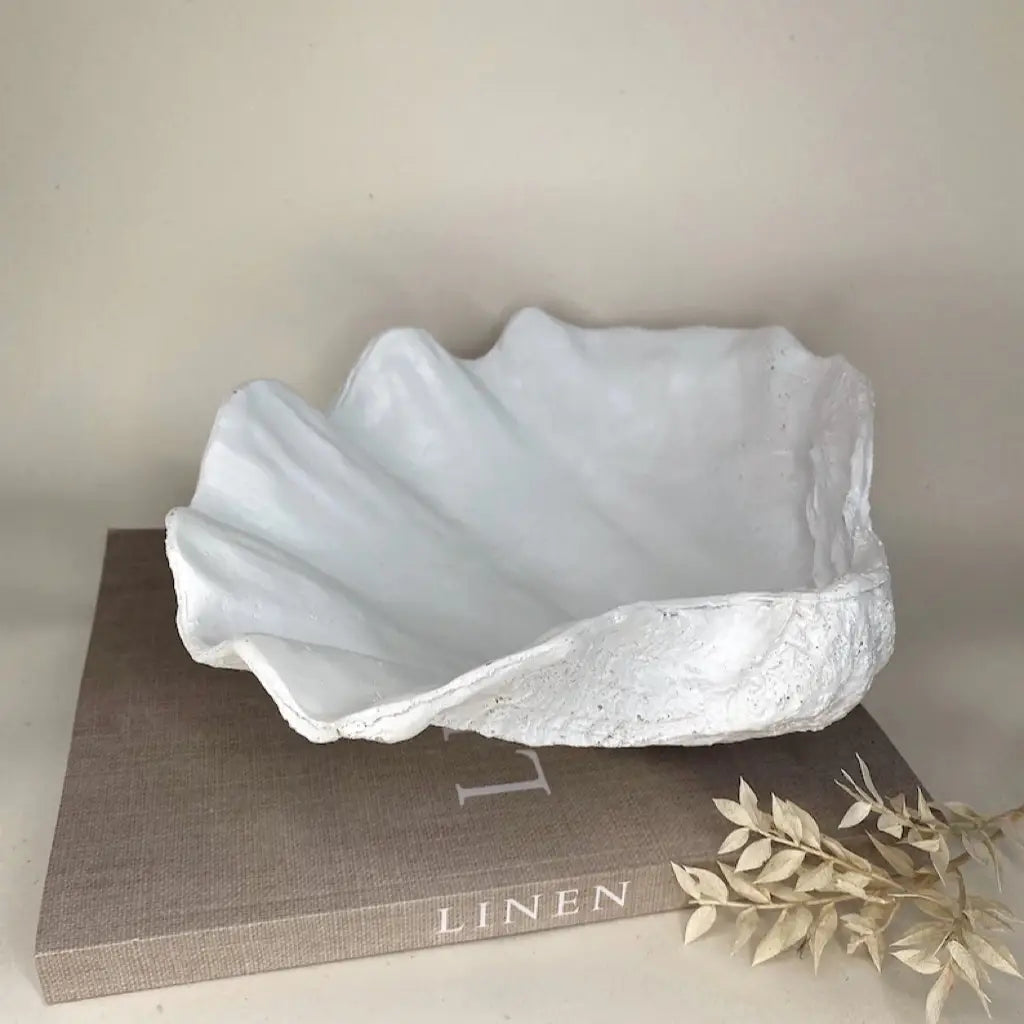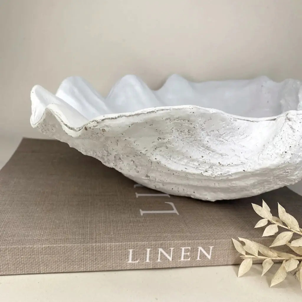 A striking, minimalist clam bowl in crisp white. Perfect as a standalone decorative piece or for storing household essentials, this beautiful statement item is crafted from high-quality, durable resin.