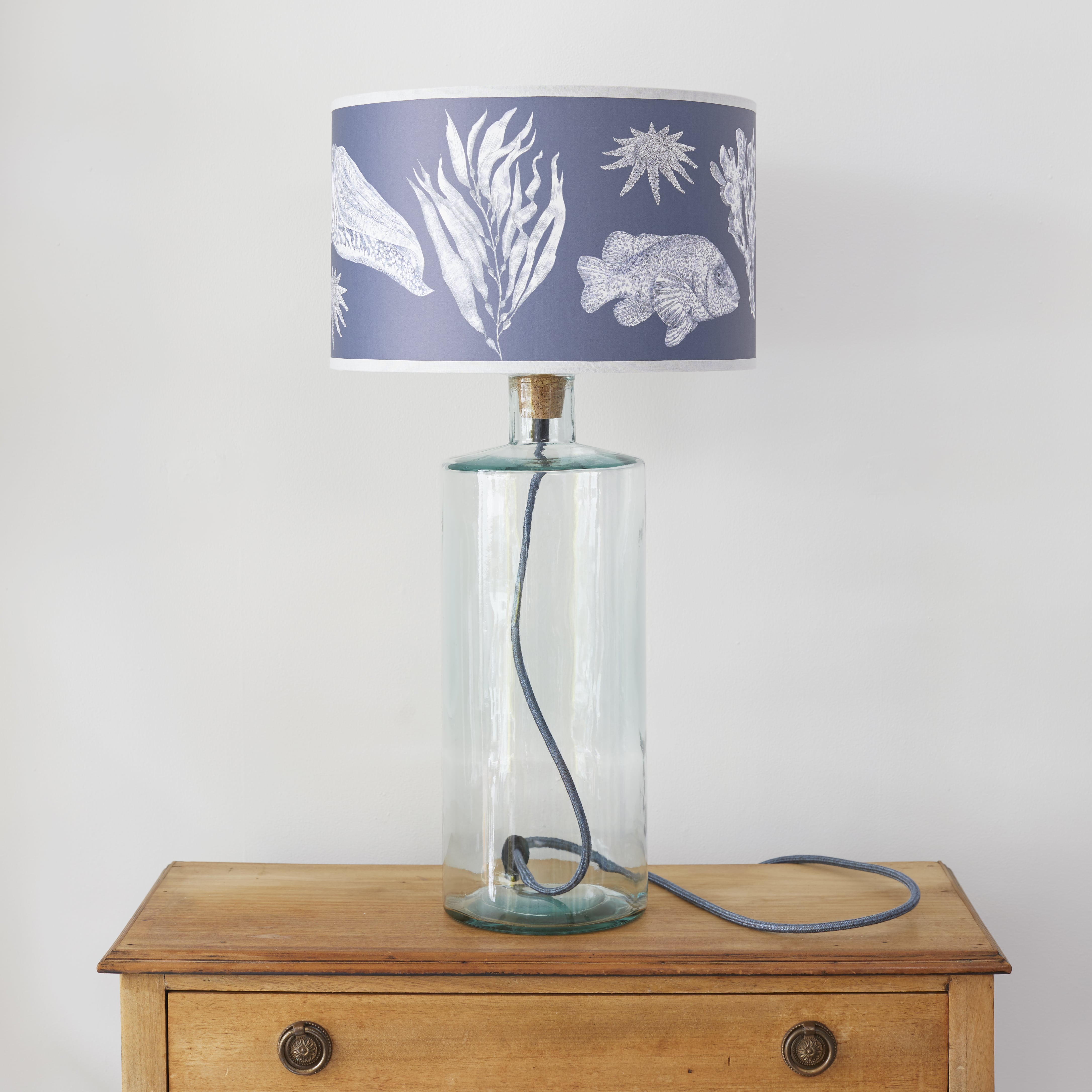 Beautiful recycled glass base with blue / grey fleck fabric cord, complete with a Solent Snapper design lampshade, in full Quink ink blue shade. The base is 46cm tall coupled with a 30cm diameter and 19cm height shade.