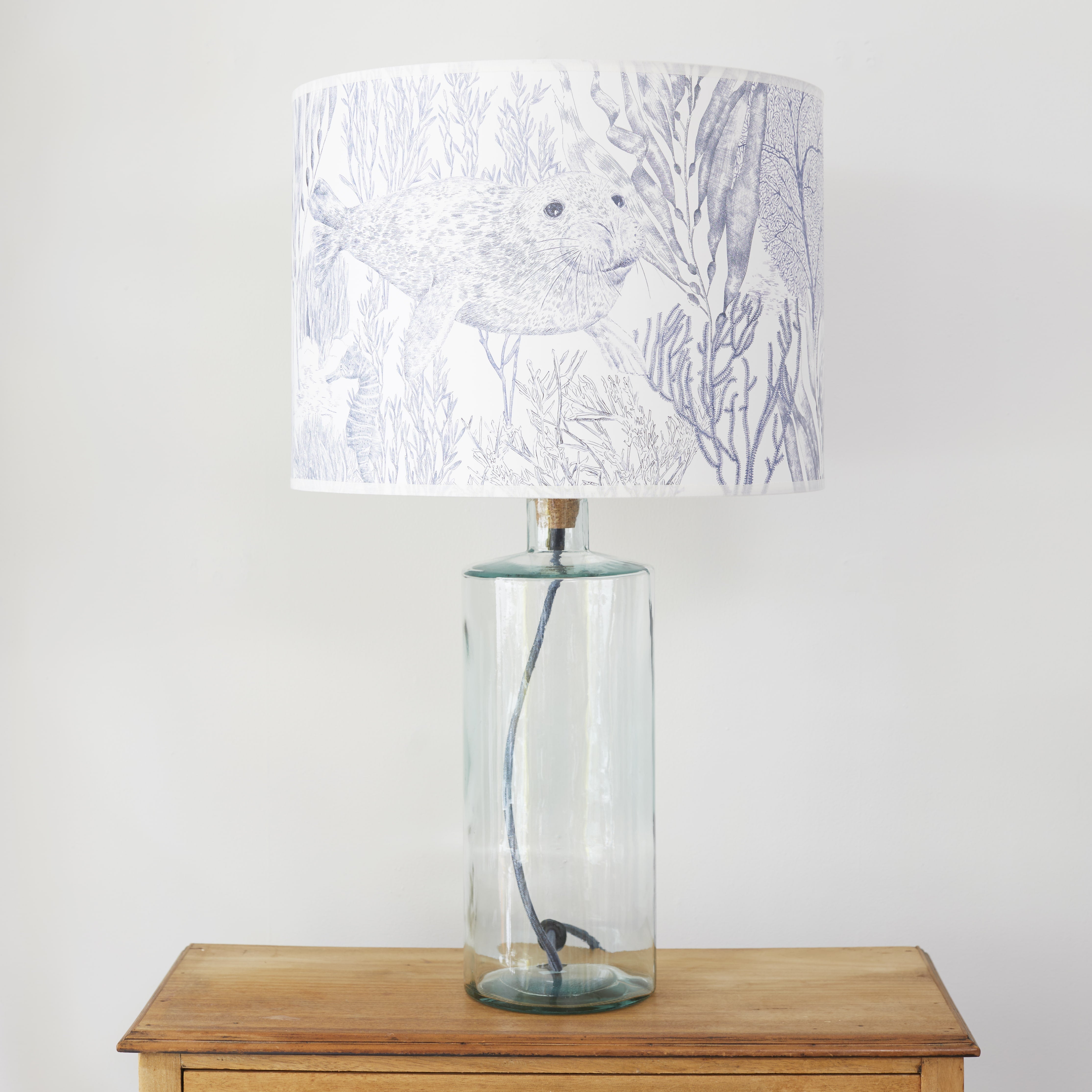 Beautiful tall recycled glass base with blue with grey fleck fabric cord, complete with a Seaview design lampshade. The base is 46cm tall coupled with a 45cm diameter and 19cm height shade.