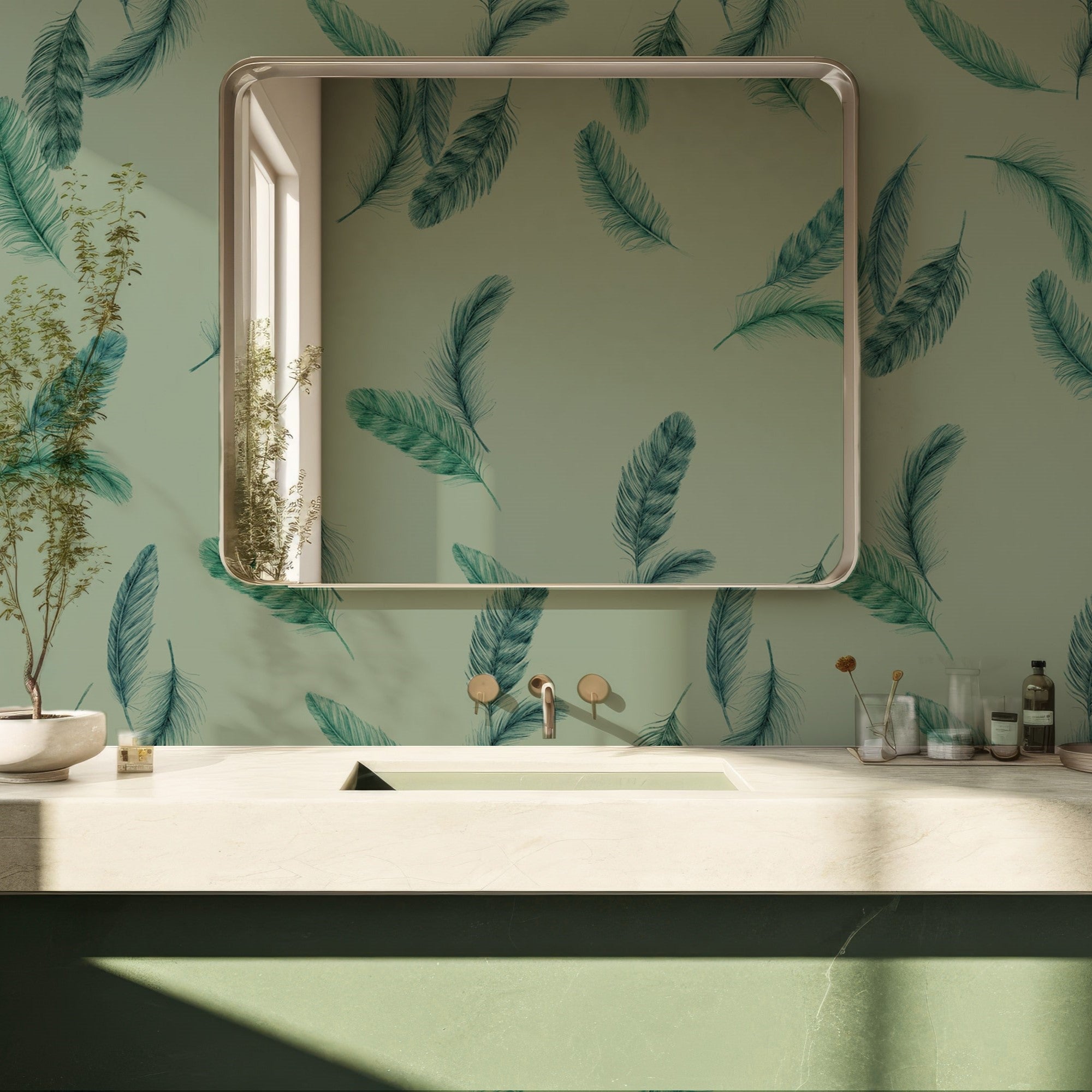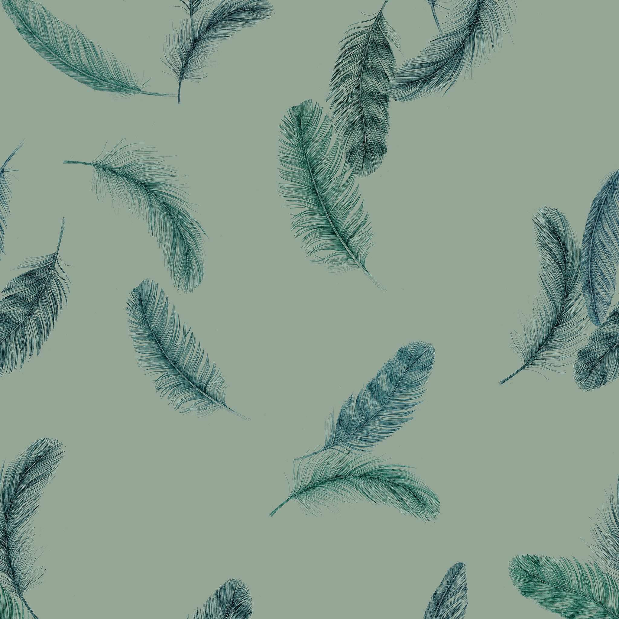 Blue green background, with soft tonal teal feathers of varying intensity.