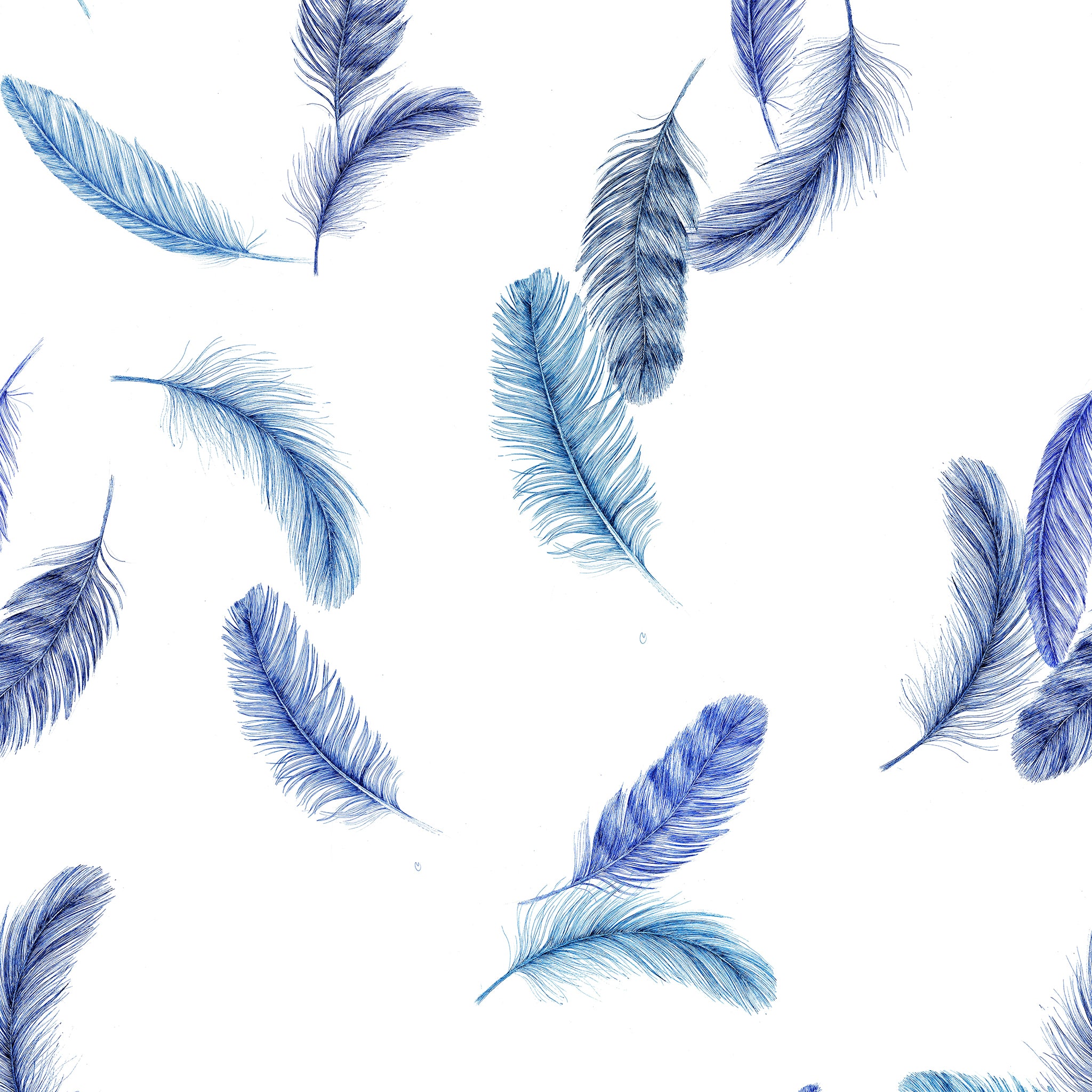 Bright white background, with our signature blues as feathers of varying intensity.