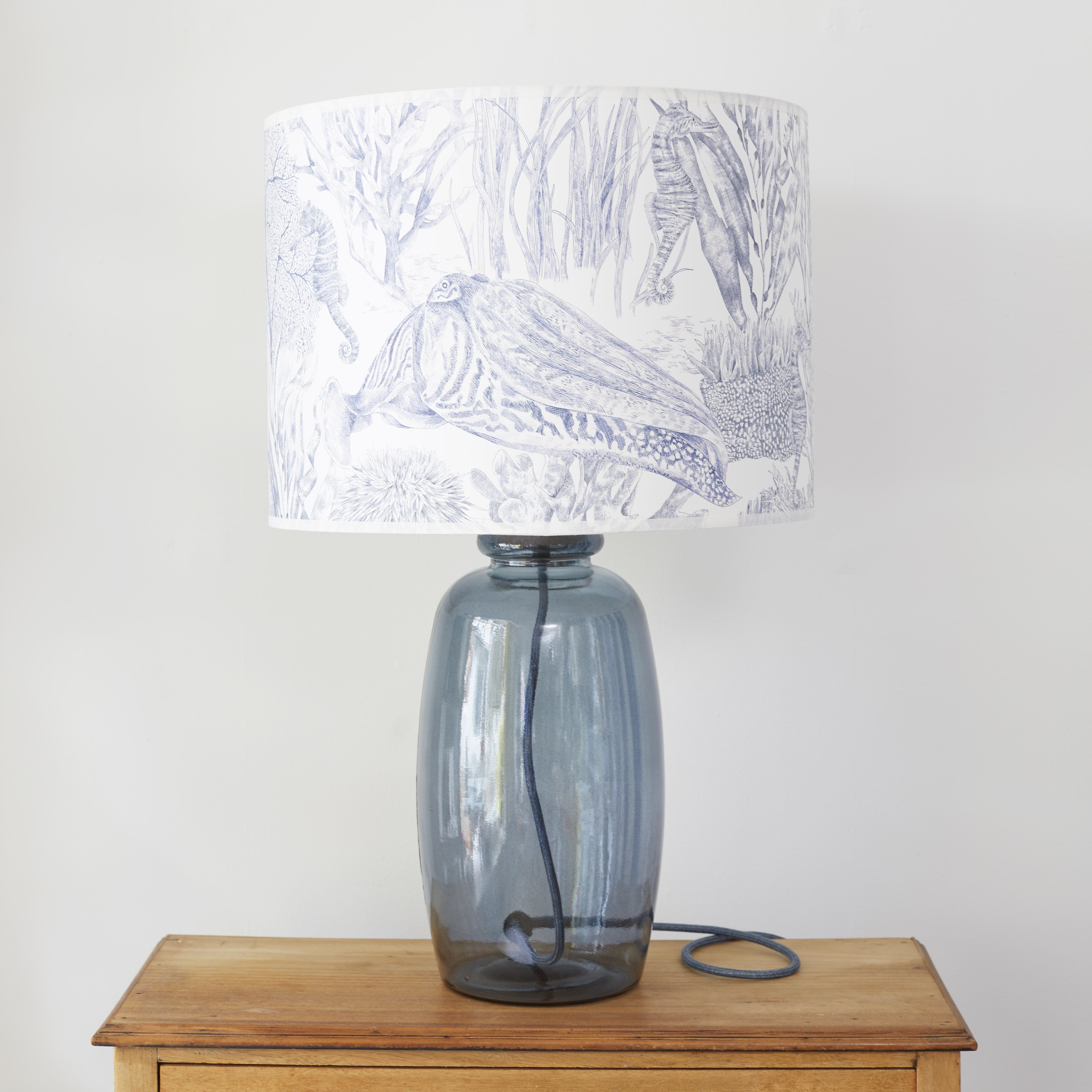A vase shaped based made of recycled glass in a navy slade shade, with cork and brass fittings,  coupled with a hand-made shade printed with one of our XV designs, to match each collection. This base comes with our Seaview Mural design in Quink blue ink, on a pale cream background.