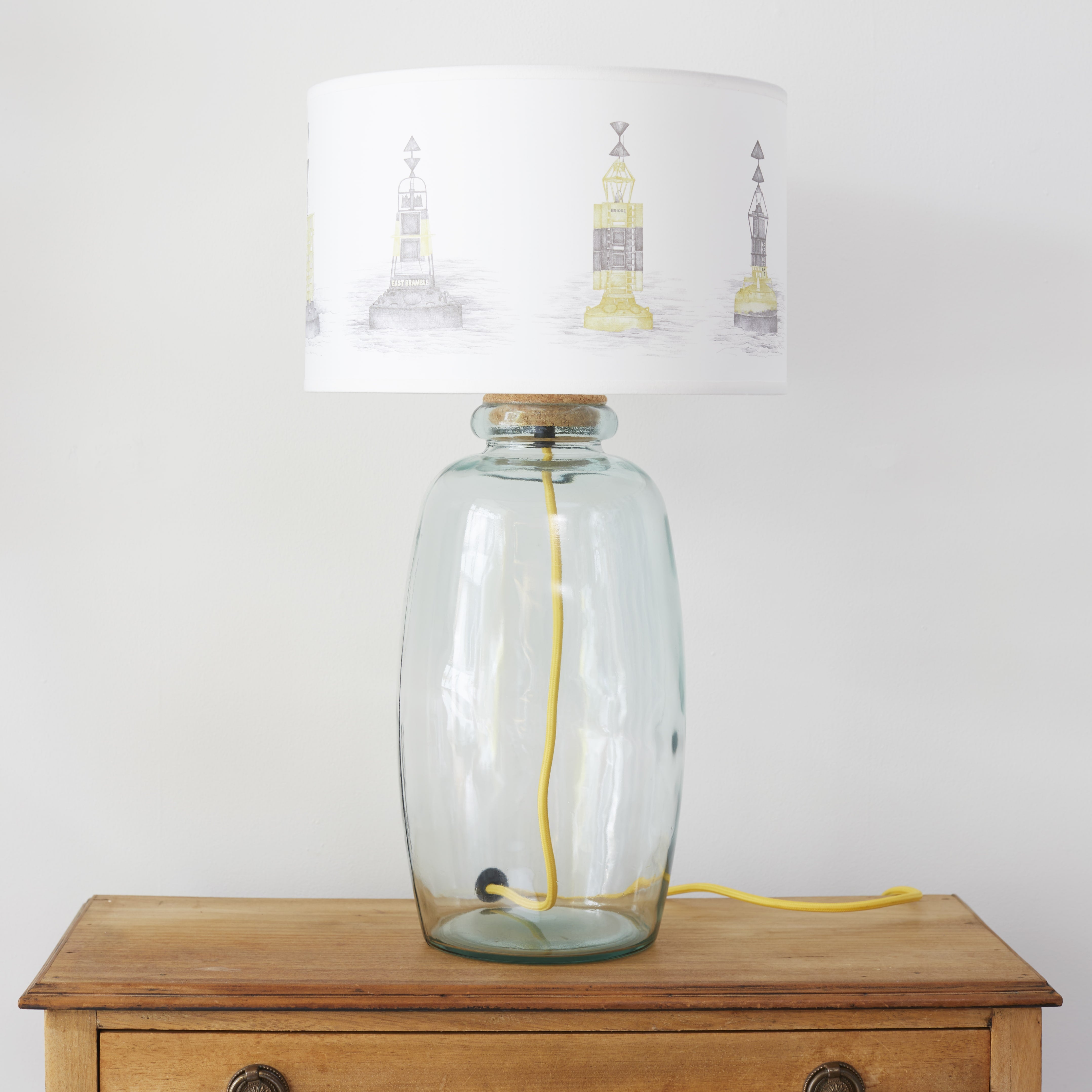 A vase shaped based made of recycled glass, with cork and brass fittings, coupled with a hand-made shade printed with one of our XV designs, to match each collection. This base comes with our Solent Cardinal design shade, complete with matching yellow cord.
