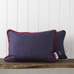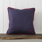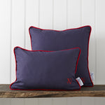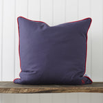 Navy blue cushion, finished with red cord piping. Our Naked Colour range is straight forward and simple. We have choosen a selection of coastal blues to accompany our hand-drawn collections, finished with complimenting cord piping from the range, with some lovely cotton white rope options to create a nautical theme.